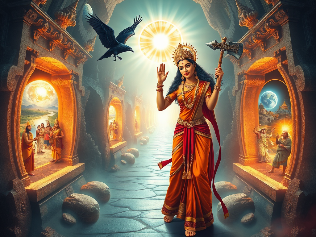 Scientific Parallel: This story aligns with the Many-Worlds Interpretation (MWI) of quantum mechanics, which postulates that all possible outcomes of a quantum decision happen in separate, branching universes. Kakbhusundi’s journey is essentially the traversal of alternate realities—much like navigating a multiverse.